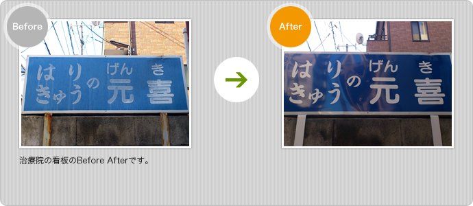 バイオタフのコーティング作業だけです。すなわち、今まで多くの時間を費やした紫外線でチョーキングした看板再生工程を、①人件費の面、②作業性の面、