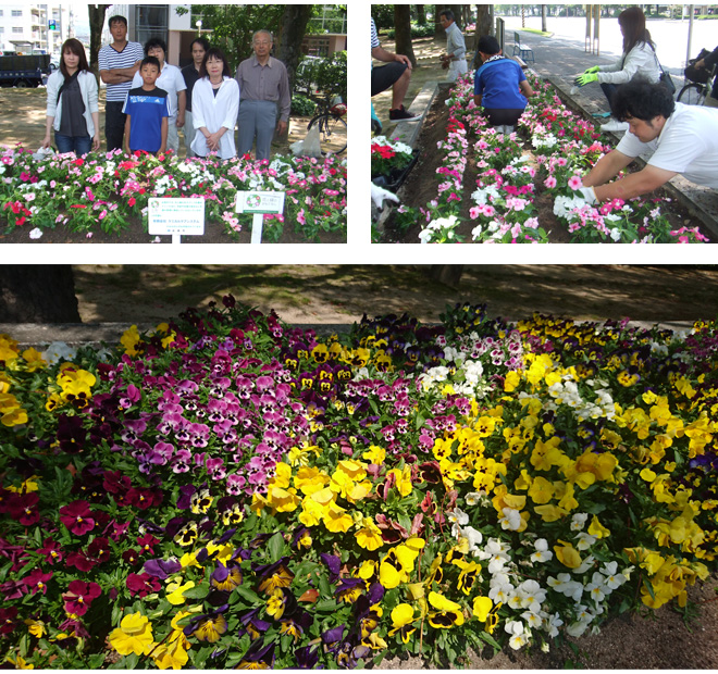 広島のシンボルの一つである、平和大通りの花壇の1区画の花の植え付けと維持管理(水やりと草取り)を昨年から始めました。「潤いのある緑のまちづくりの推進事業」として広島市が進めている事業への参画、今回で5度目です。