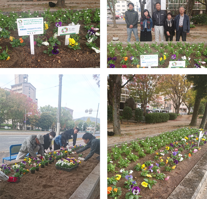 広島のシンボルの一つである、平和大通りの花壇の1区画の花の植え付けをしました。「潤いのある緑のまちづくりの推進事業」として広島市が進めている事業への参画、今回で8度目です。